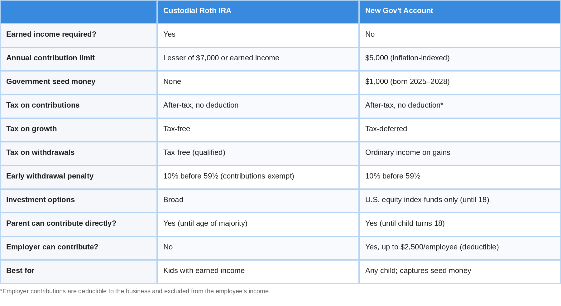 *Employer contributions to the new government-backed account are deductible to the business and excluded from the employee’s income. Individual contributions are after-tax with no deduction.