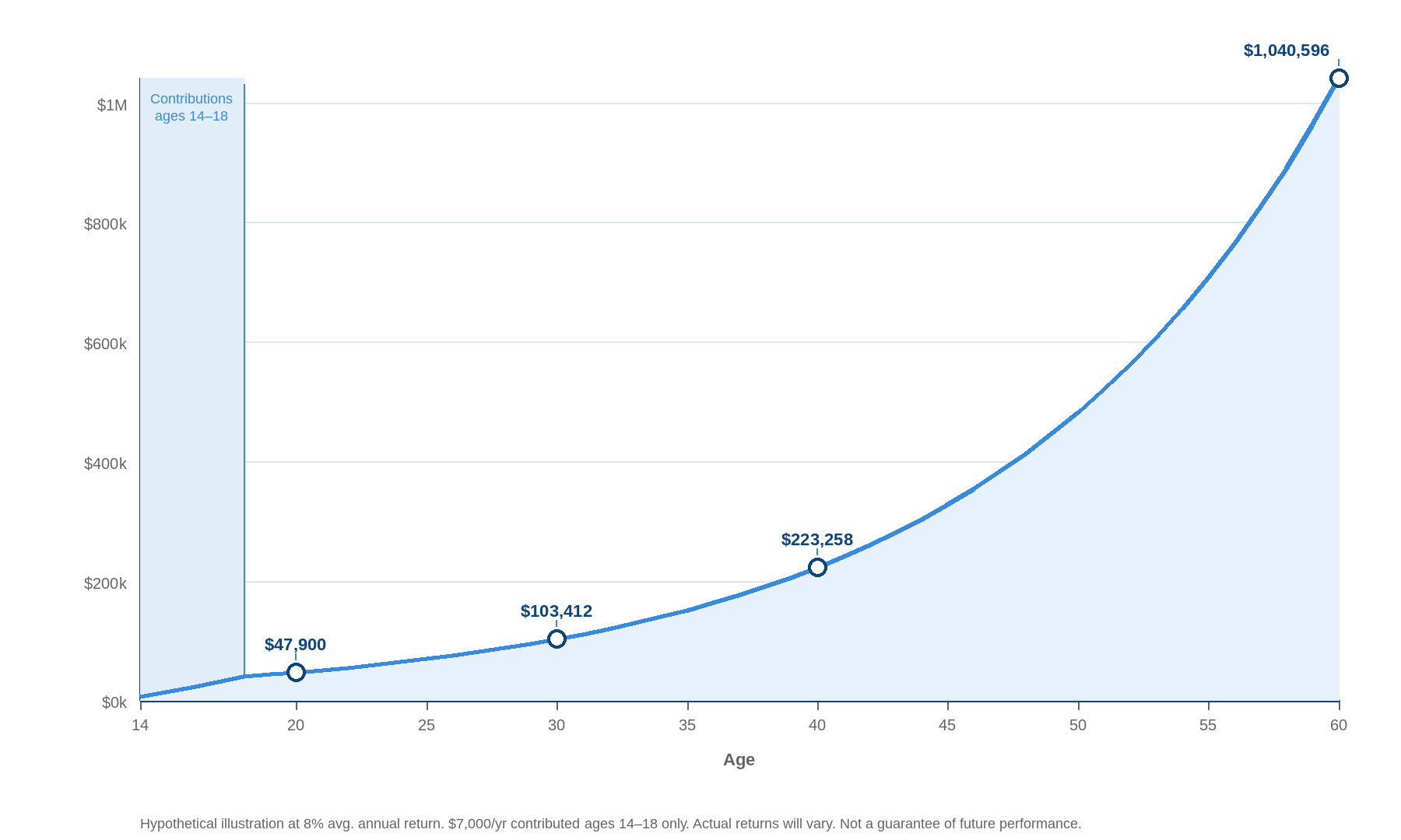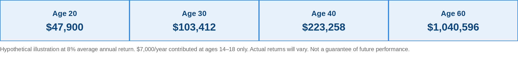 Hypothetical illustration at 8% average annual return. Contributions of $7,000/year made at ages 14–18 only. Actual returns will vary. Not a guarantee of future performance.