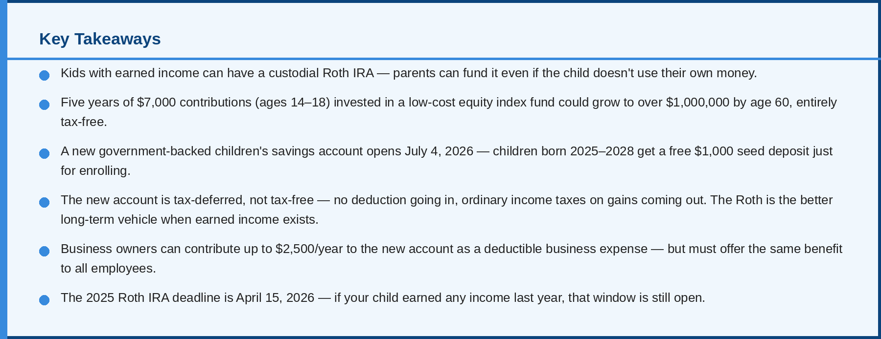 The honest comparison: the new account wins most clearly in two scenarios — when the $1,000 (or $250) seed money is in play, or when an employer is contributing on the child’s behalf tax-free. Those are genuinely valuable, and the seed money alone is worth capturing. But if you’re funding the account entirely on your own with after-tax dollars, no deduction, and ordinary income taxes owed on gains at withdrawal, a Roth IRA (when the child has earned income) or a thoughtfully managed taxable account may well serve your child better in the long run.